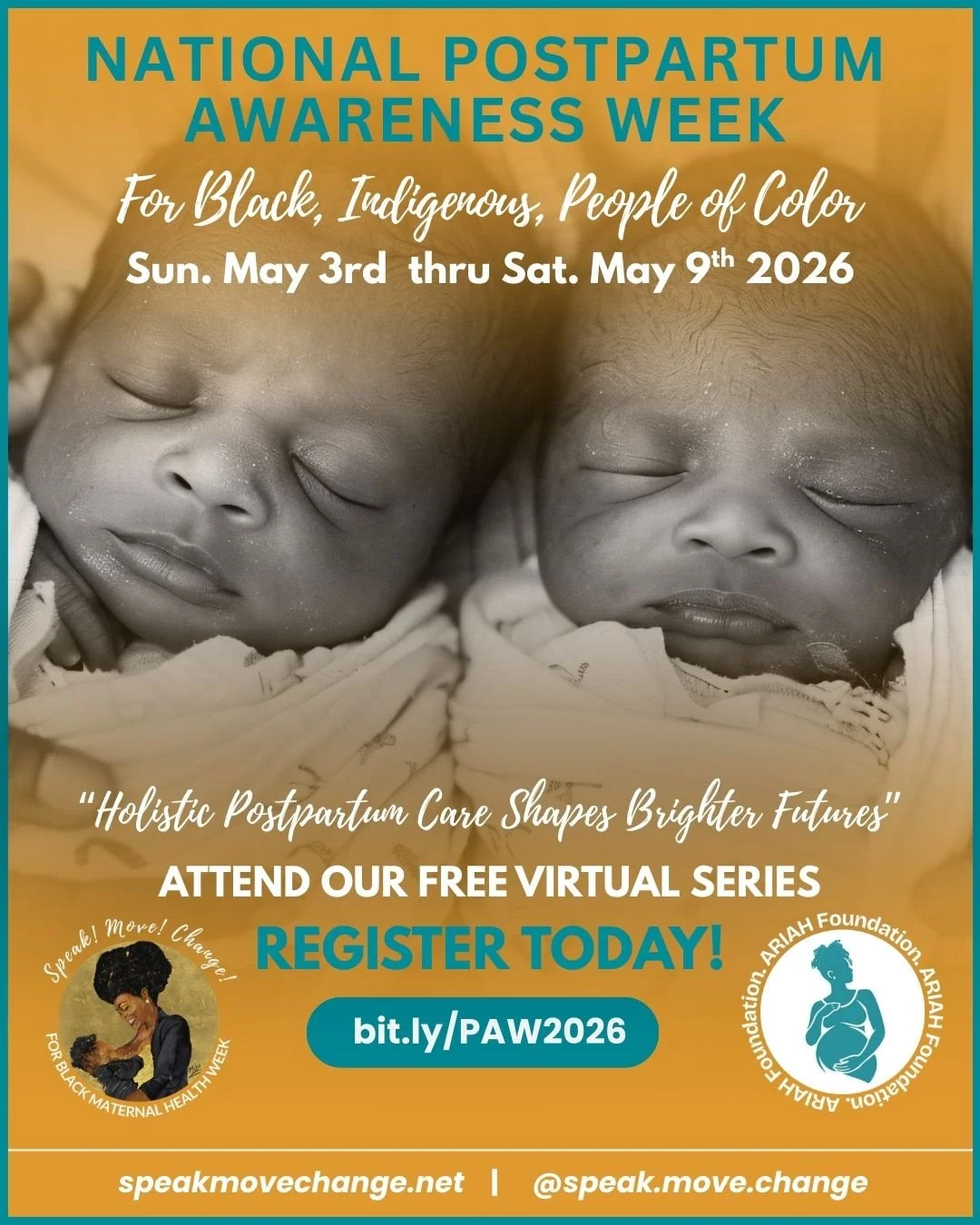 Join us for a weeklong virtual series from Sunday, May 3rd to Saturday, May 9th, 2026. Through the power of collective action, this campaign raises awareness about the inequitable and unacceptable impact of systemic and institutional racism experienced by BIPOC during their pregnancy, birthing and postpartum journeys.